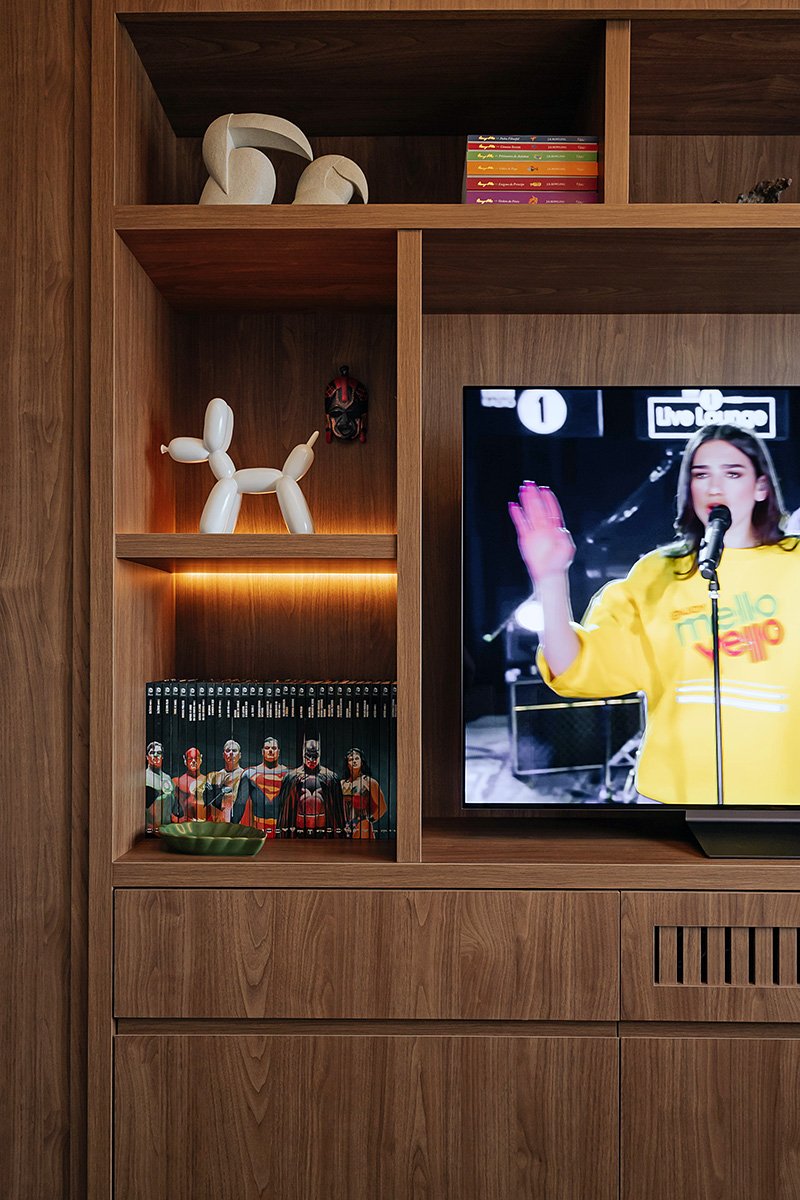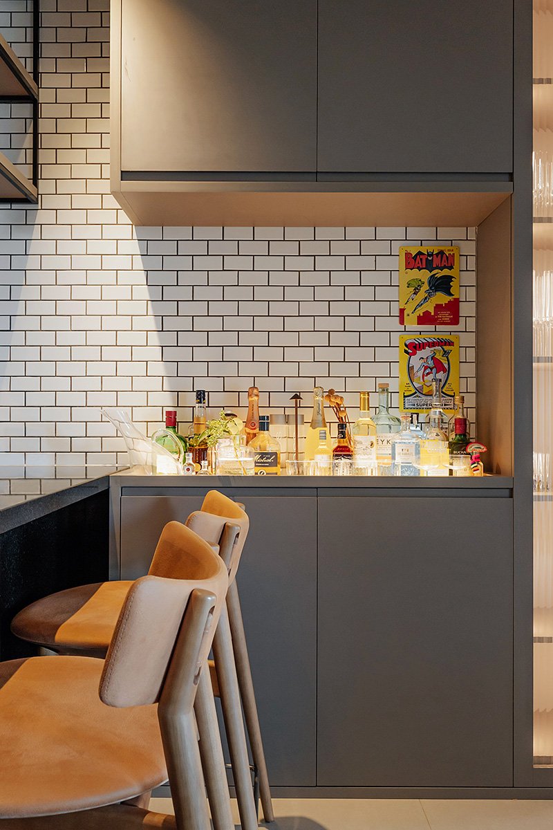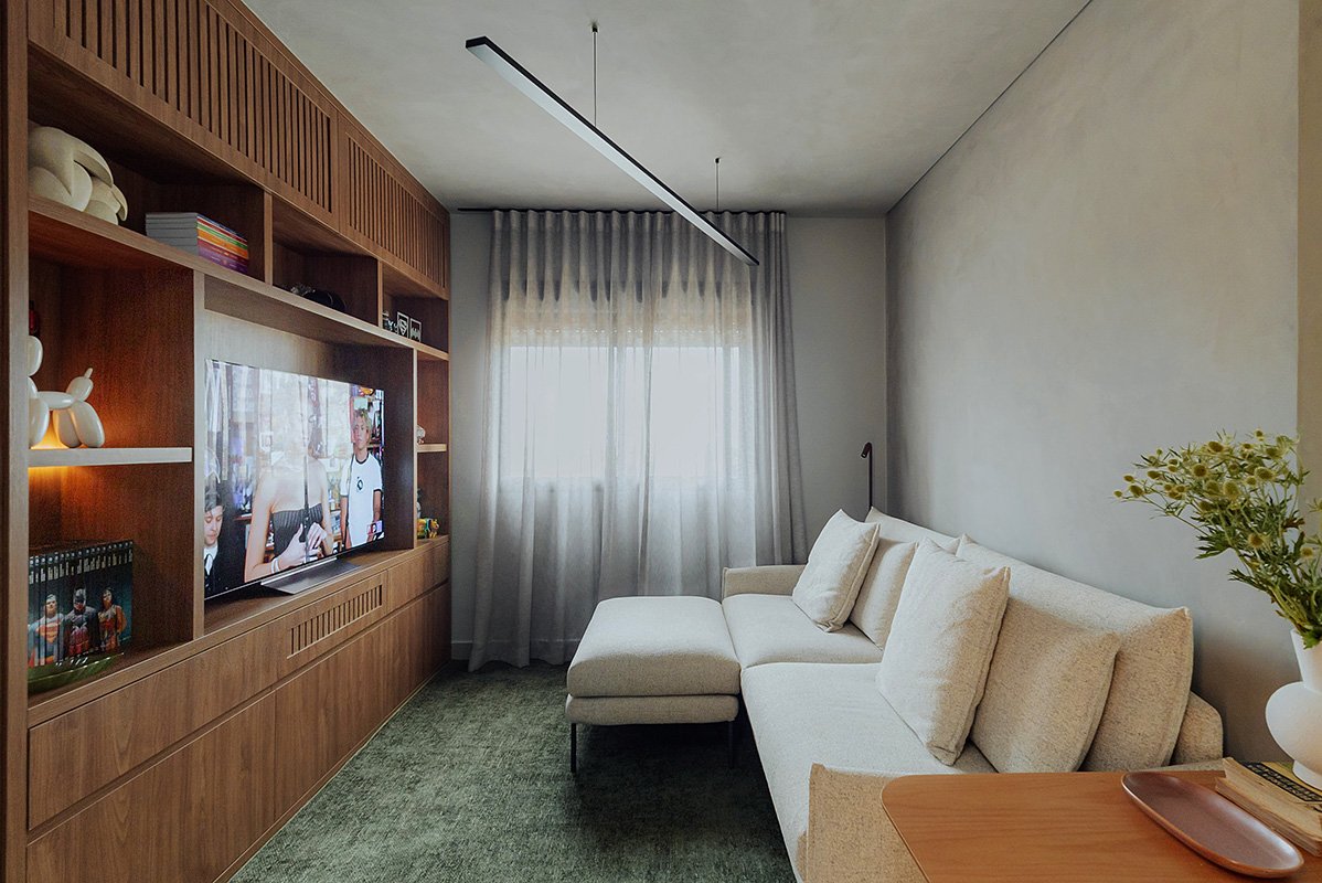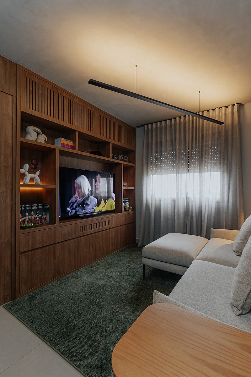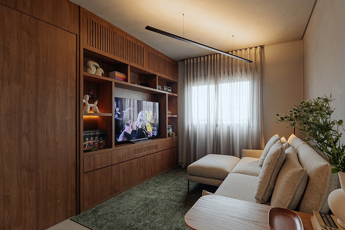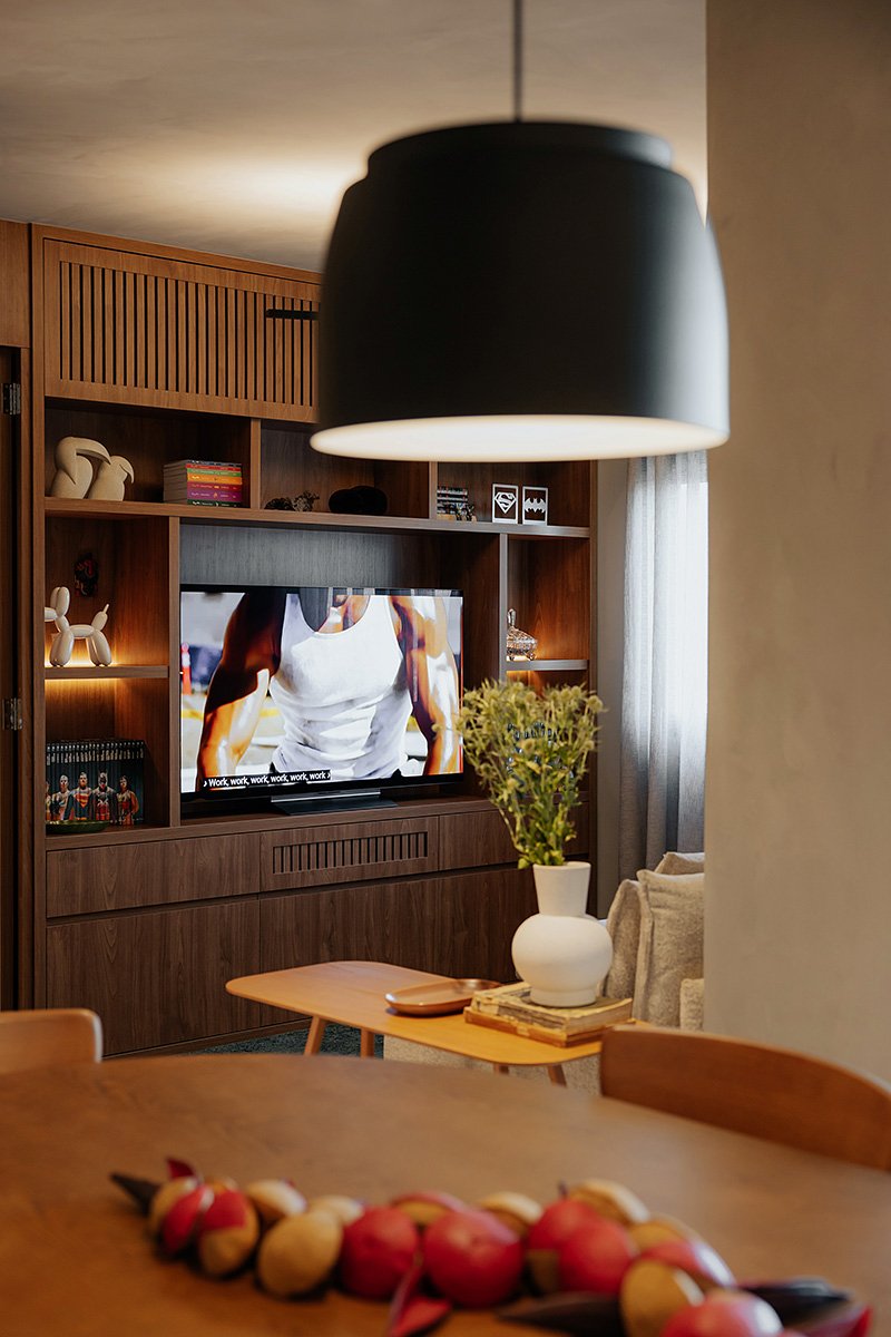 Neste projeto, um dos principais pedidos do cliente foi a manutenção integral dos revestimentos originais entregues pela construtora. Antes de contratar nosso escritório, ele já havia adquirido um kit de revestimentos personalizados sugerido pela própria construtora, e nosso desafio foi integrar essas escolhas ao novo conceito do apartamento, garantindo unidade estética, personalidade e funcionalidade aos ambientes.