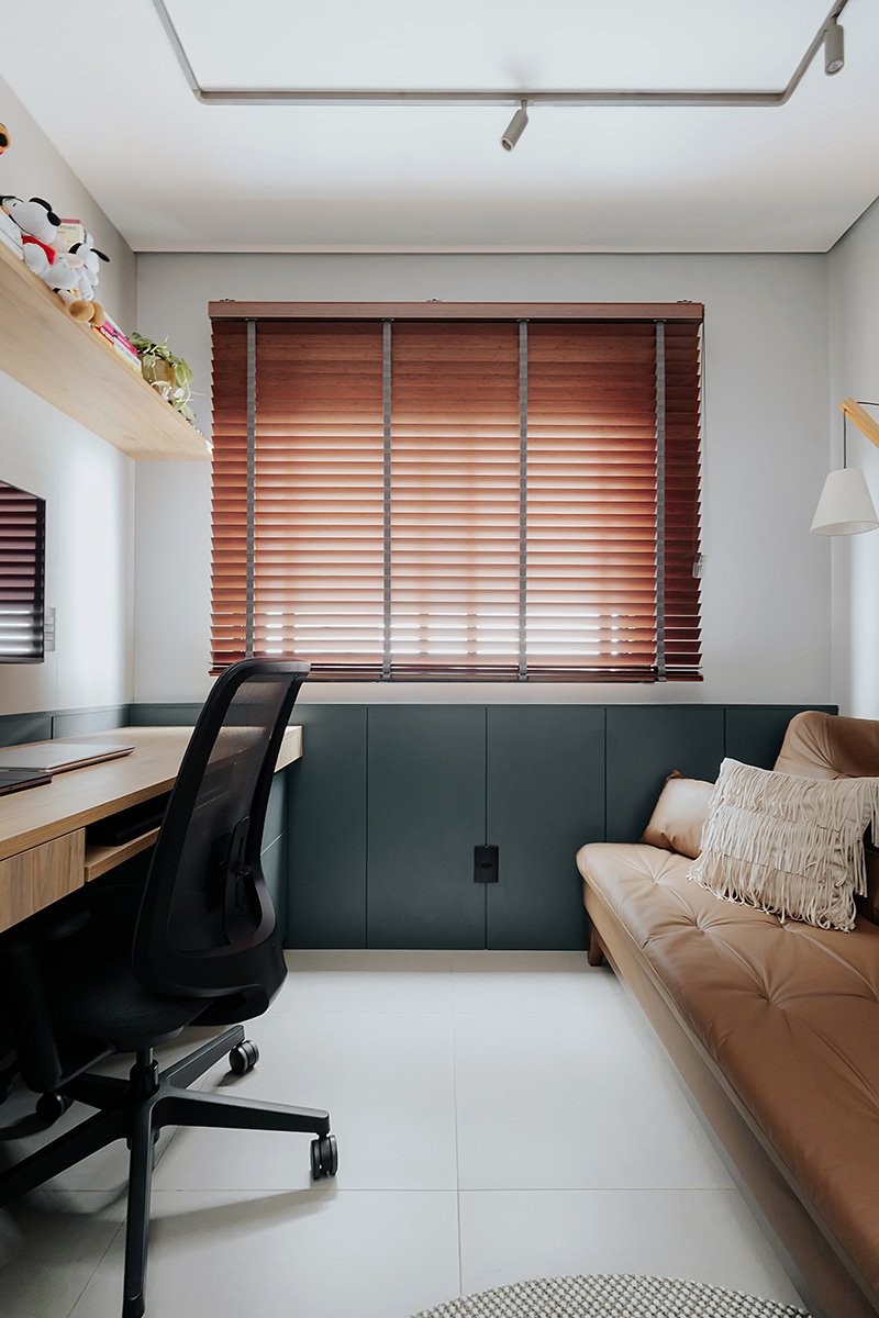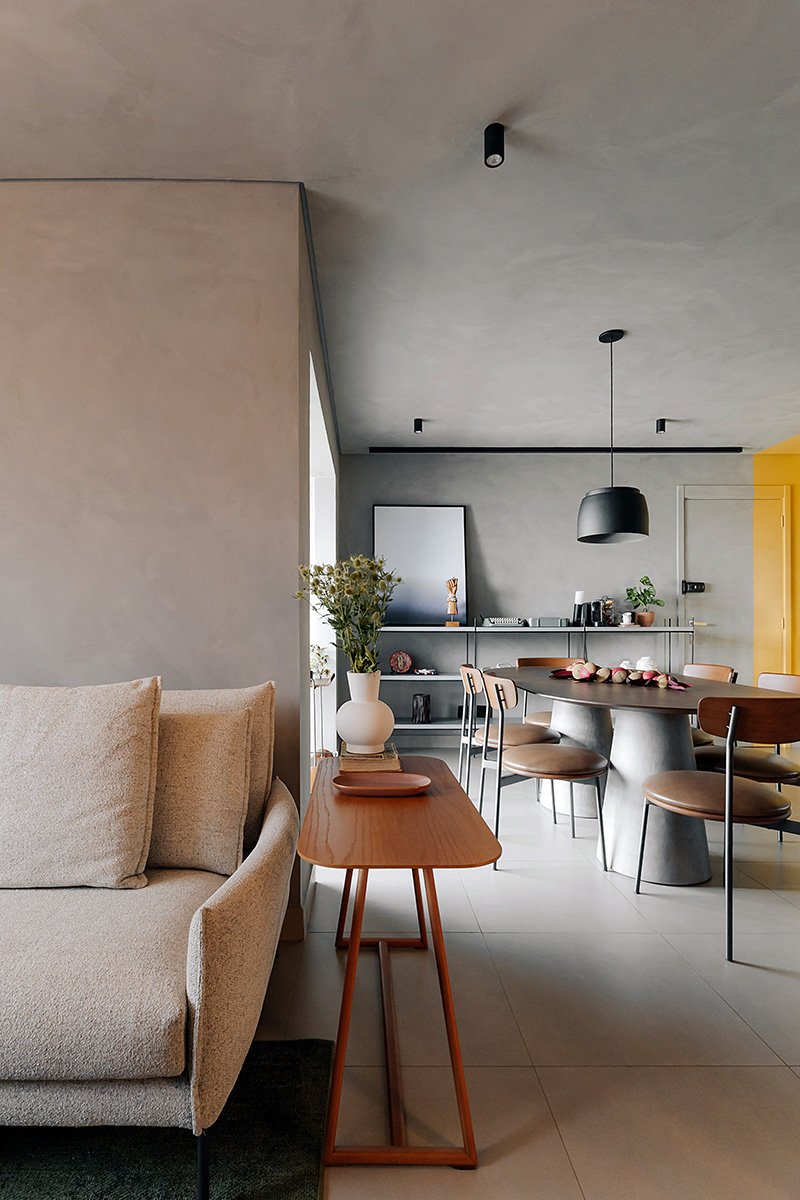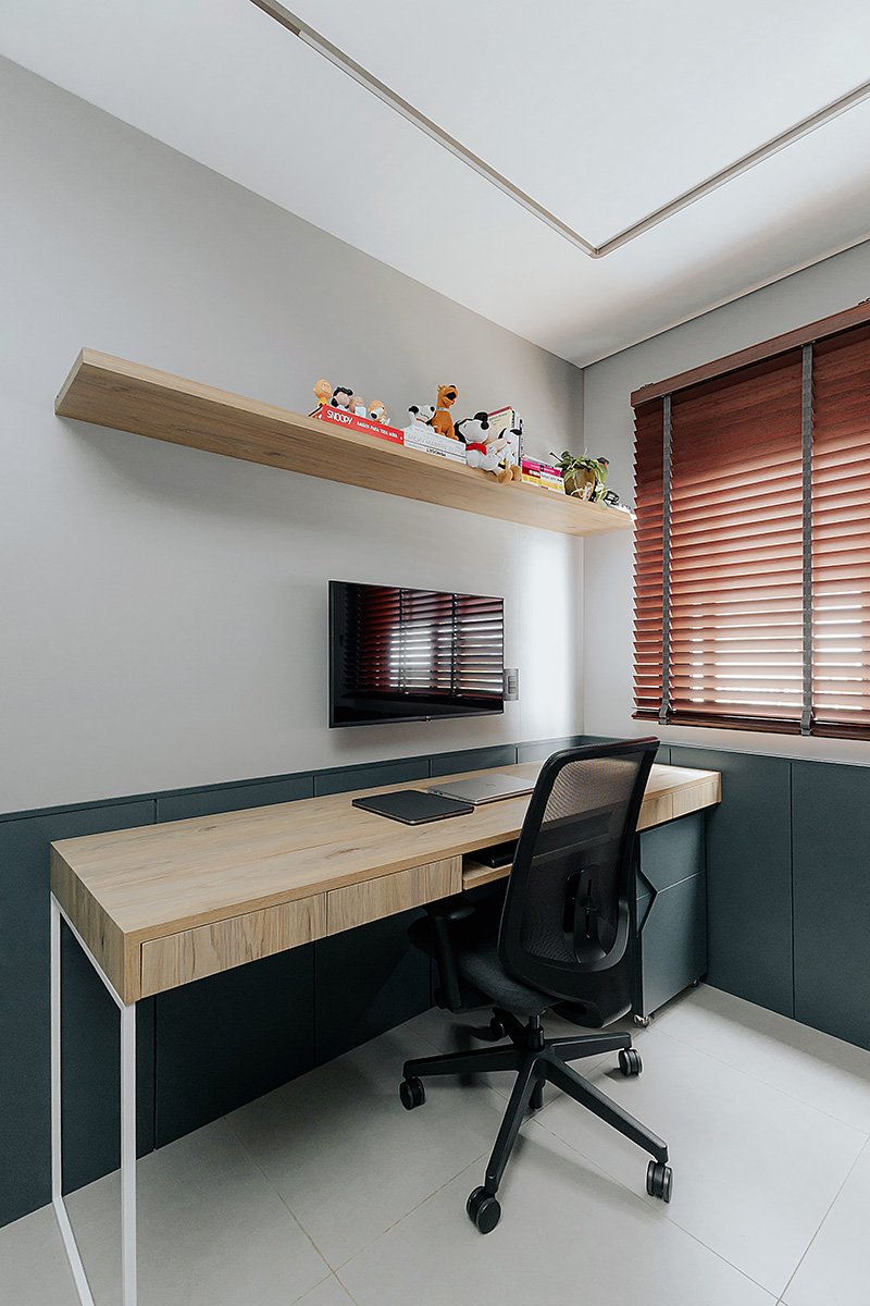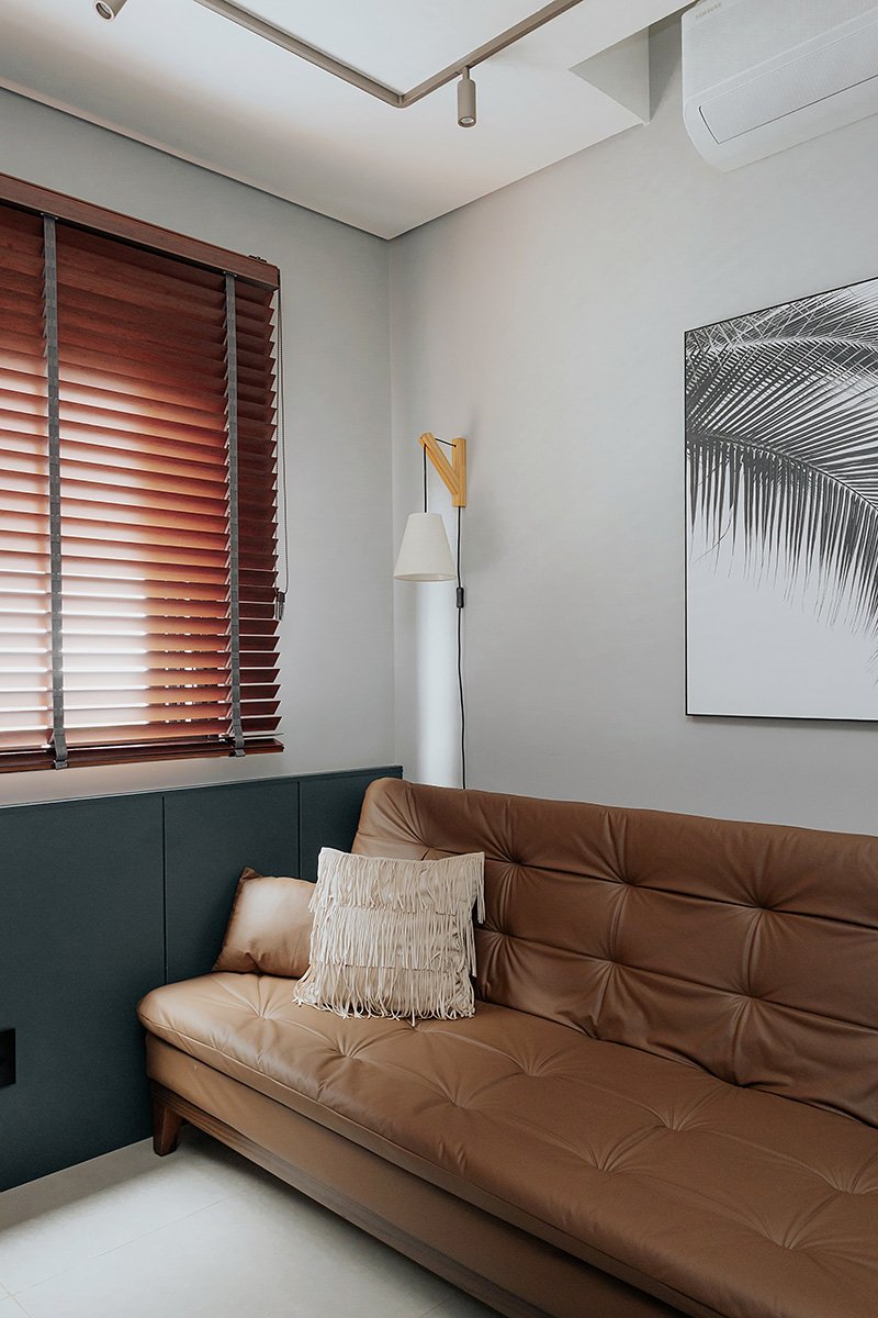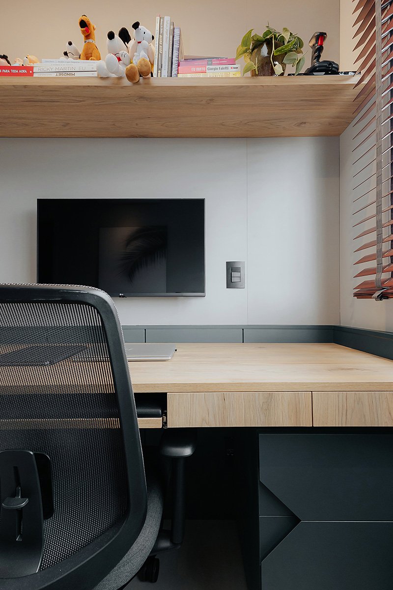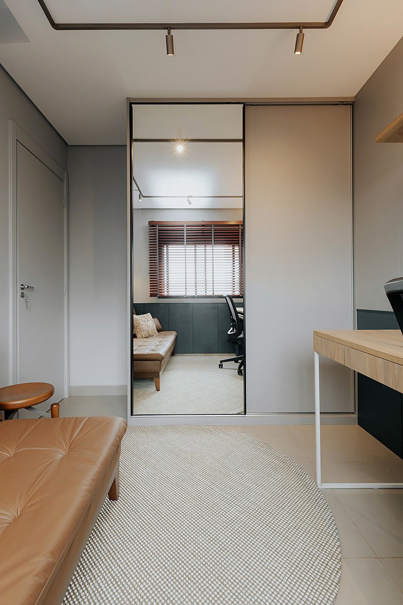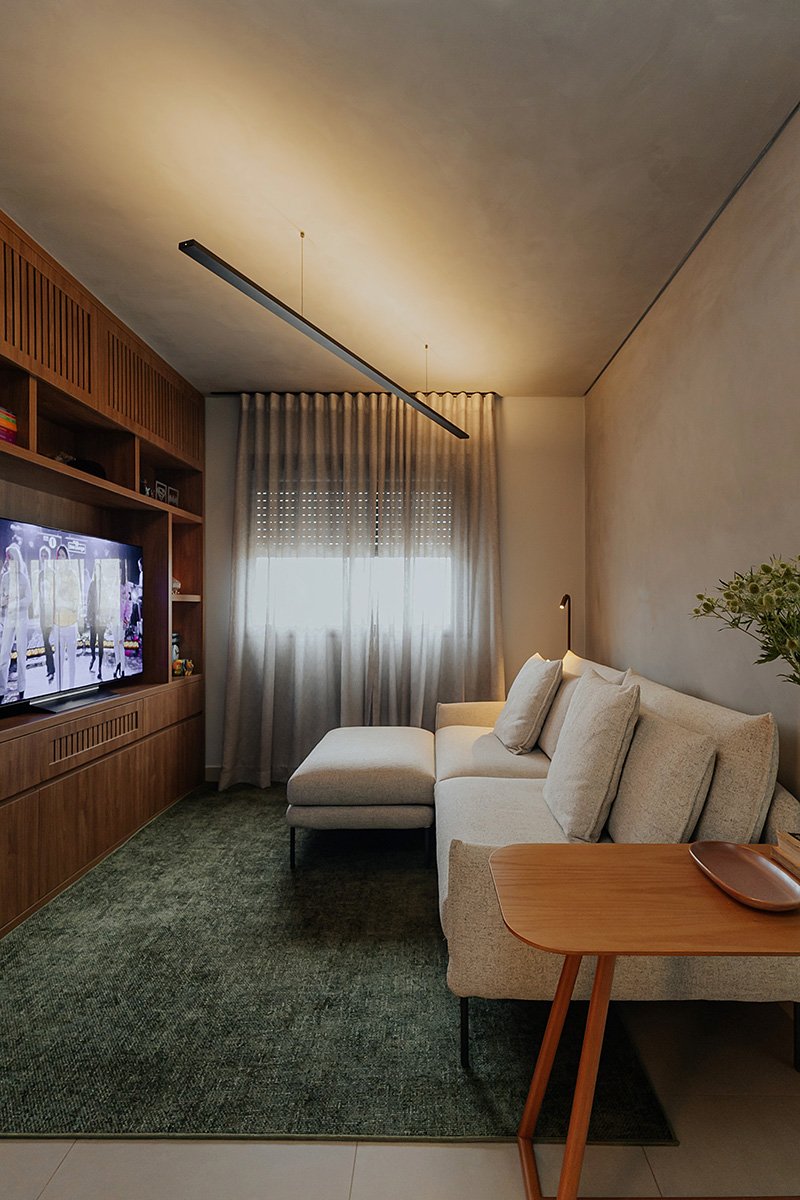 Neste projeto, um dos principais pedidos do cliente foi a manutenção integral dos revestimentos originais entregues pela construtora. Antes de contratar nosso escritório, ele já havia adquirido um kit de revestimentos personalizados sugerido pela própria construtora, e nosso desafio foi integrar essas escolhas ao novo conceito do apartamento, garantindo unidade estética, personalidade e funcionalidade aos ambientes.