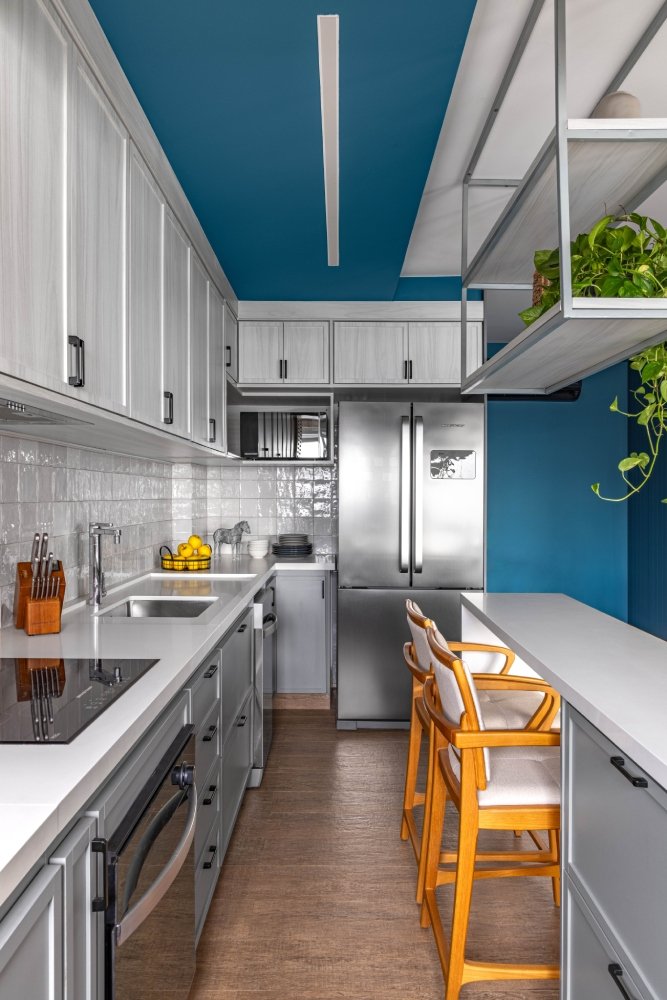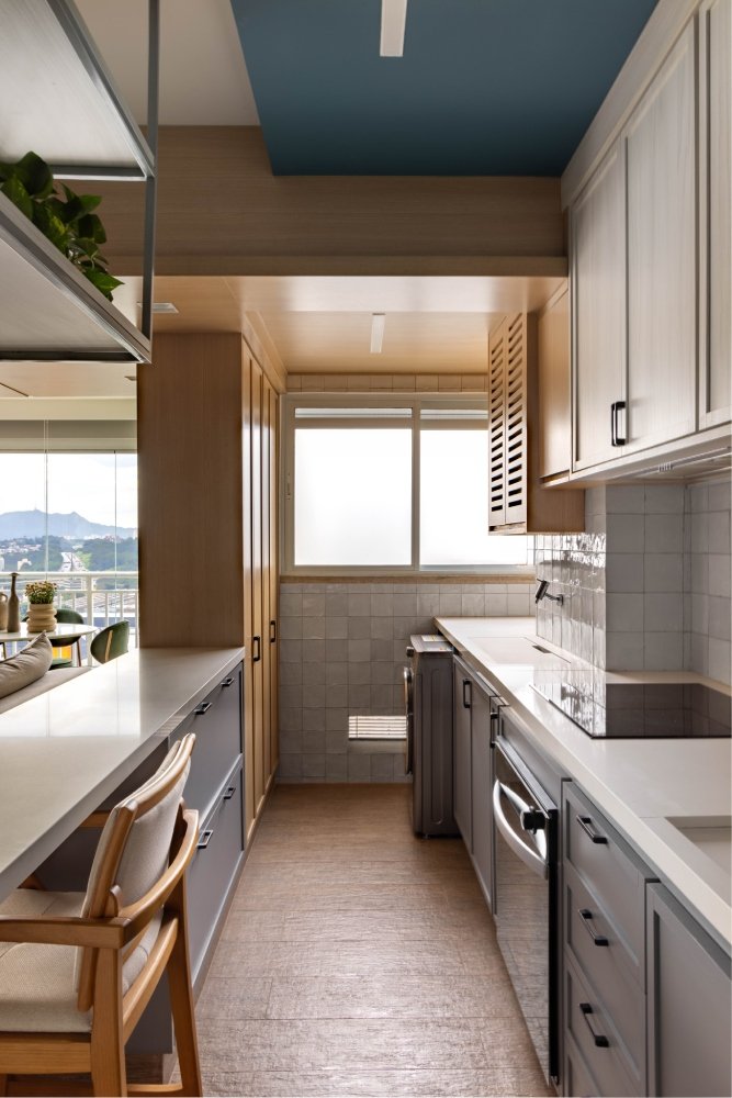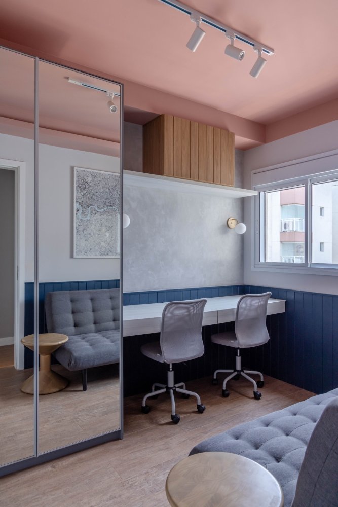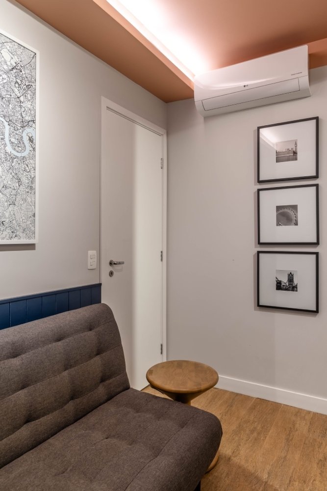 Além disso, abrimos uma porta de correr entre o quarto do casal e um outro quarto existente, criando um closet nesse quarto. Uma parte desse quarto serviu, ainda, para ampliar a profundidade da sala.