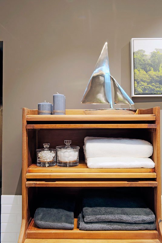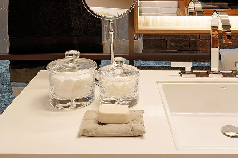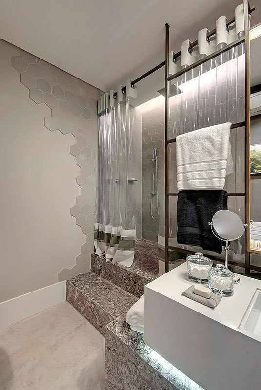 Projeto concebido para um banheiro compartilhado por dois irmãos, com duas portas de acesso, sendo cada uma voltada para cada um dos quartos dos meninos. Utilizamos vários tons sóbrios de cinza, com aplicações de branco, verde e alguns toques naturais como madeira e revestimento artesanal com tom terroso.
