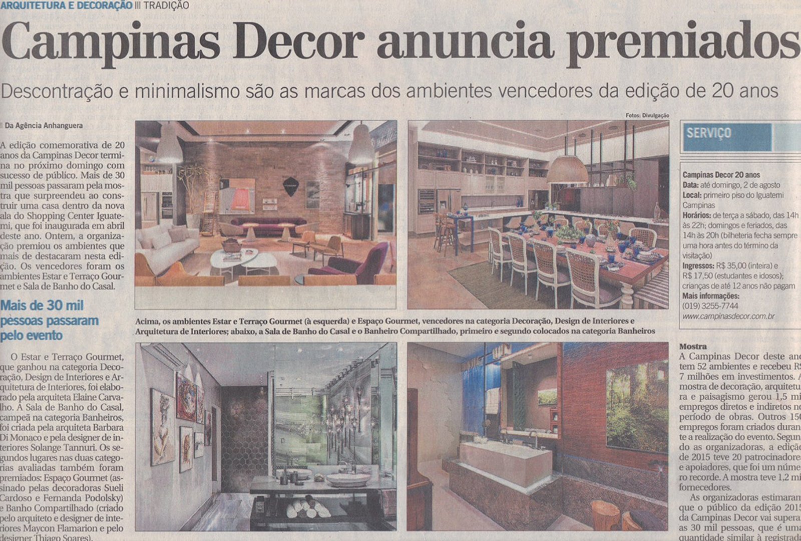 A reportagem apresentou os ambientes eleitos pelo júri técnico como os melhores apresentados na edição de 2015 da Campinas Decor, entre eles o nosso espaço Banheiro Compartilhado.