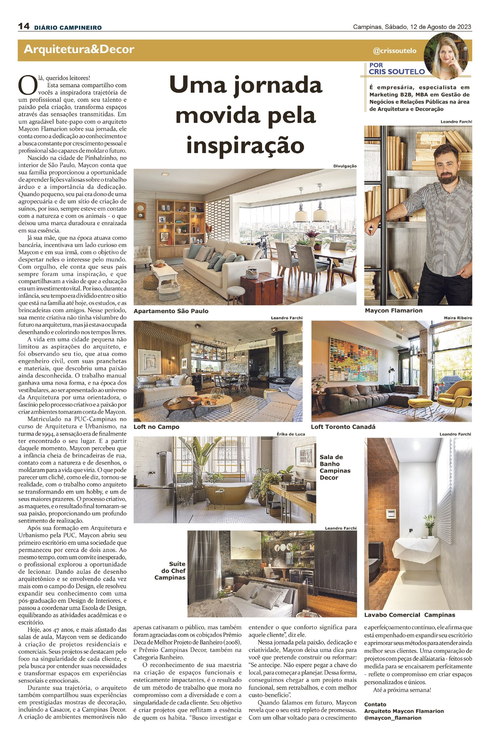 Jornal Diário CampineiroPor admin / 13/05/2024 A edição de 12 de agosto de 2023 do jornal contou um pouco da trajetória profissional do arquiteto Maycon Flamarion, na coluna escrita pela Cris Soutelo. Clique na imagem para ampliar e ler a coluna.