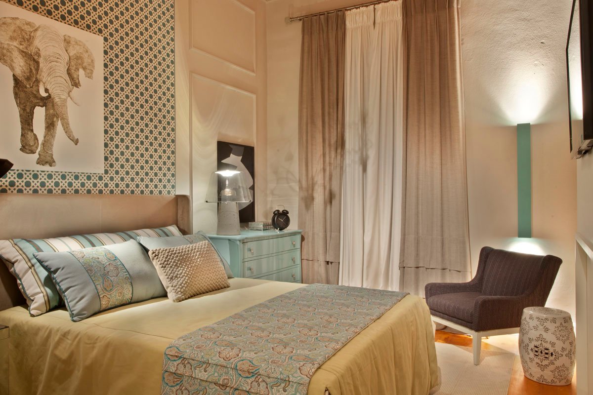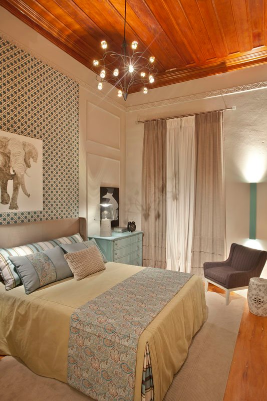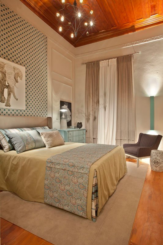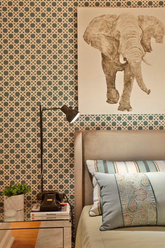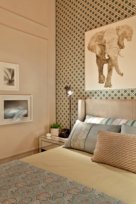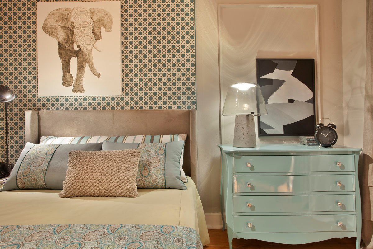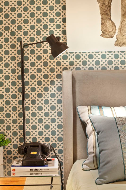 A paleta de cores neutras é enriquecida com toques de azul claro e verde limão suave, criando uma sensação de tranquilidade e frescor. Um dos elementos mais marcantes é o painel em MDF azul, que recebeu um adesivo em tom bege, recortado a laser, simulando o delicado desenho da tradicional palhinha indiana, trazendo textura e identidade para o quarto.