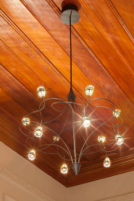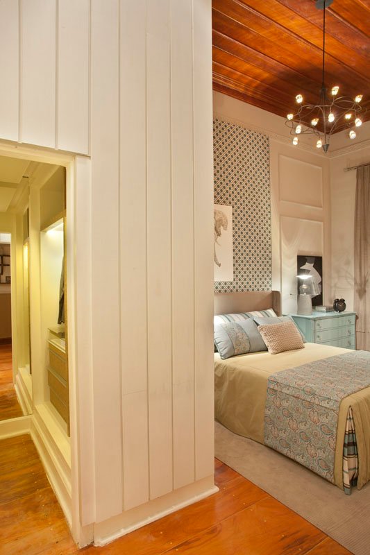 Para manter a imponência original do espaço, o projeto preservou o pé-direito alto, recuperando a madeira original do piso e do forro, o que confere uma atmosfera nostálgica e sofisticada ao ambiente. As paredes ganharam apliques em gesso, formando elegantes molduras e boiseries, que reforçam o estilo clássico reinterpretado de forma leve.