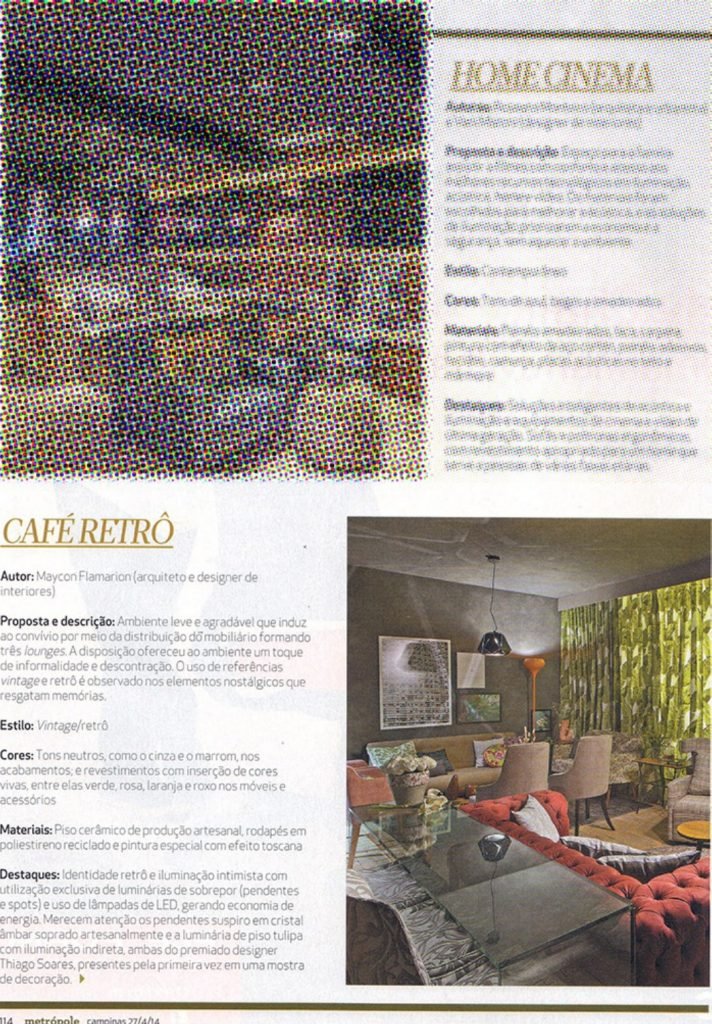 Revista MetrópolePor admin / 12/05/2024 A edição de abril de 2014 da revista metrópole destaca alguns dos ambientes da Campinas Decor do mesmo ano. Clique na imagem para ampliar e ler a reportagem.