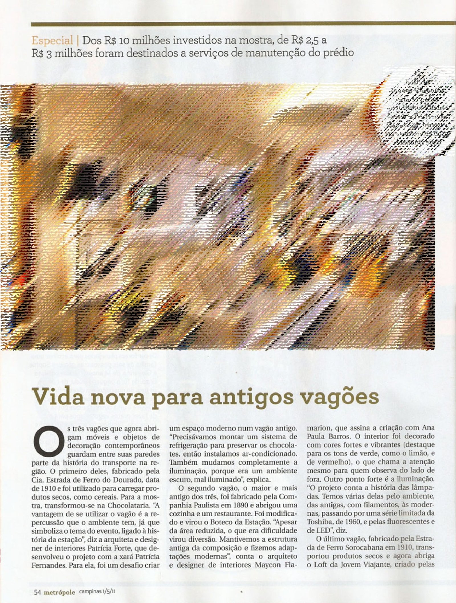 Revista MetrópolePor admin / 12/05/2024 Edição de maio de 2011, apresentando os ambientes projetados para dar vida nova a antigos vagões da Estação Cultura, em Campinas. Clique na imagem para ampliar e ler a matéria.