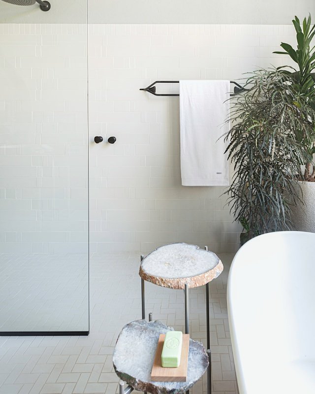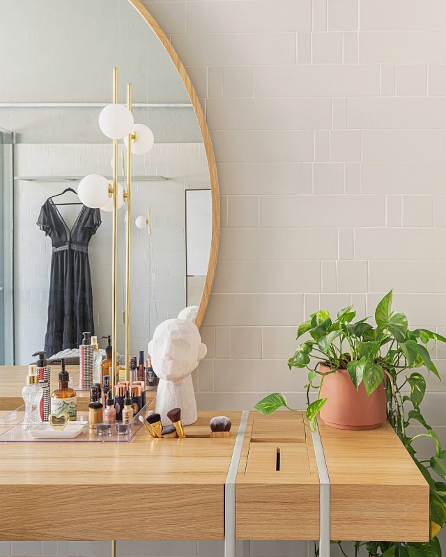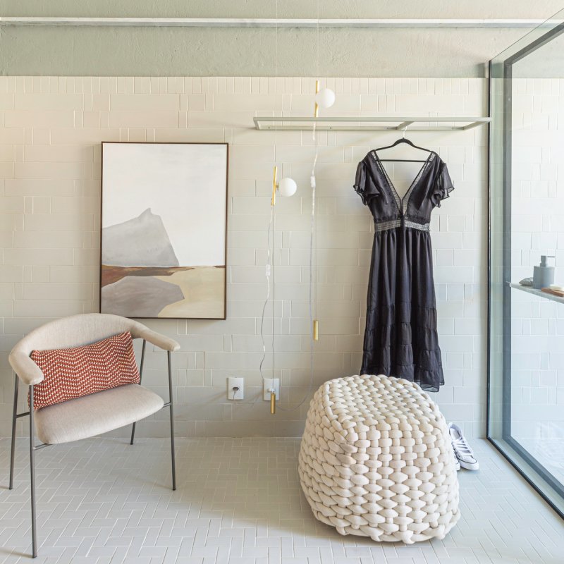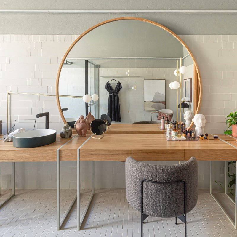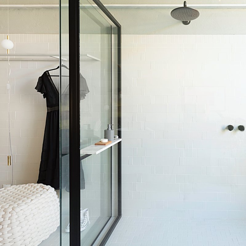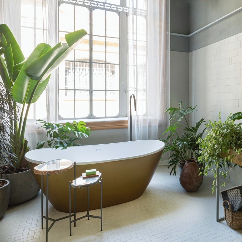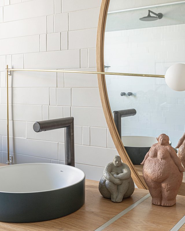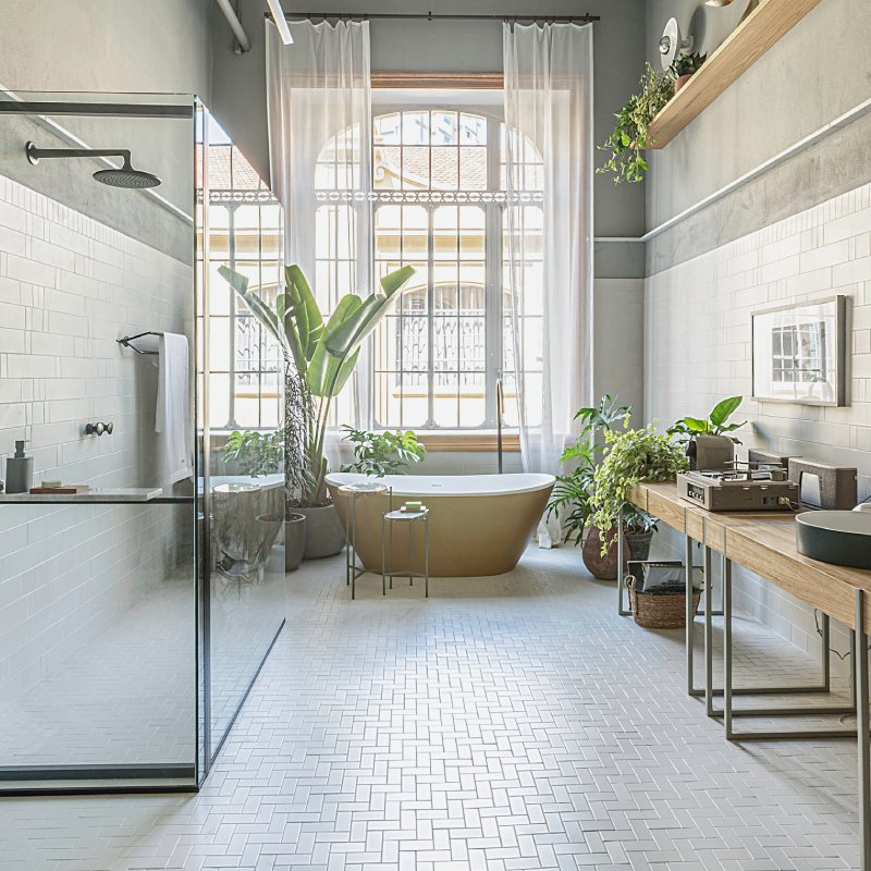 A sala de banho foi projetada em torno de uma grande janela histórica, que serve como ponto focal do espaço, permitindo a entrada abundante de luz natural e proporcionando uma vista encantadora para o exterior. Este elemento arquitetônico foi preservado e destacado, tornando-se uma característica marcante do ambiente.