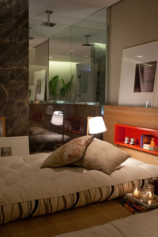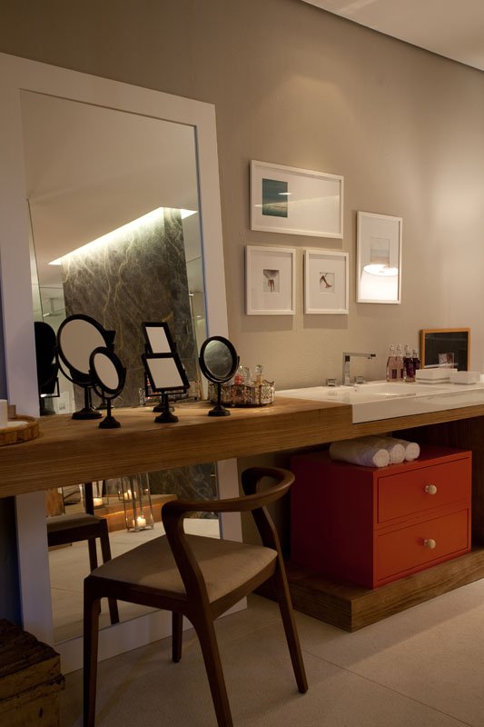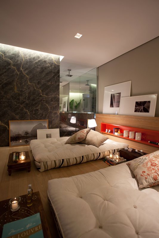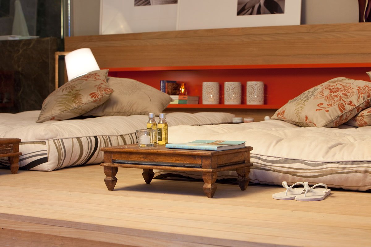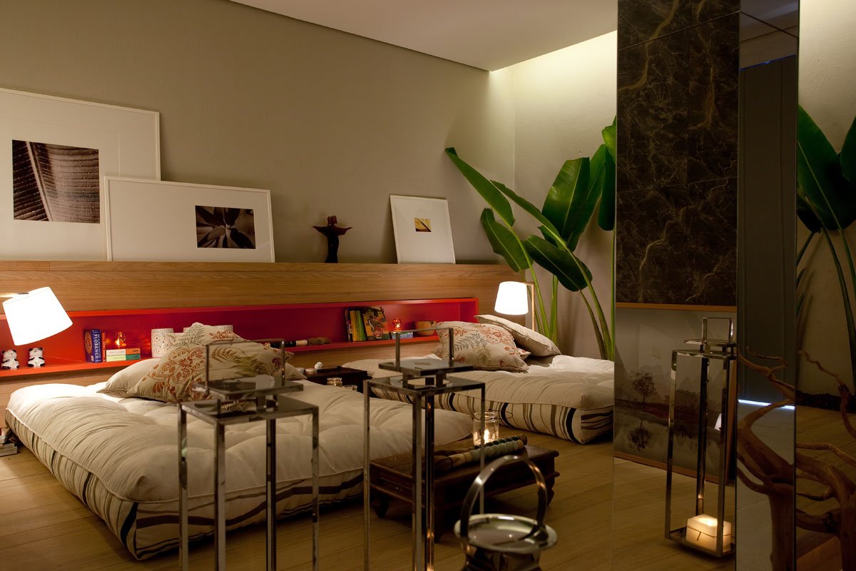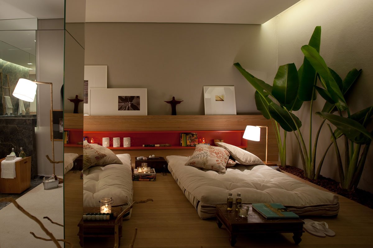 Numa das laterais do ambiente, um tablado de madeira acomoda dois futons, perfeitos para momentos de descanso, leitura ou meditação. Um nicho horizontal amplo apoia objetos e pequenos itens, mantendo tudo organizado e à mão. Já a bancada com cuba foi pensada para valorizar os rituais de autocuidado, tornando cada detalhe mais funcional e agradável.