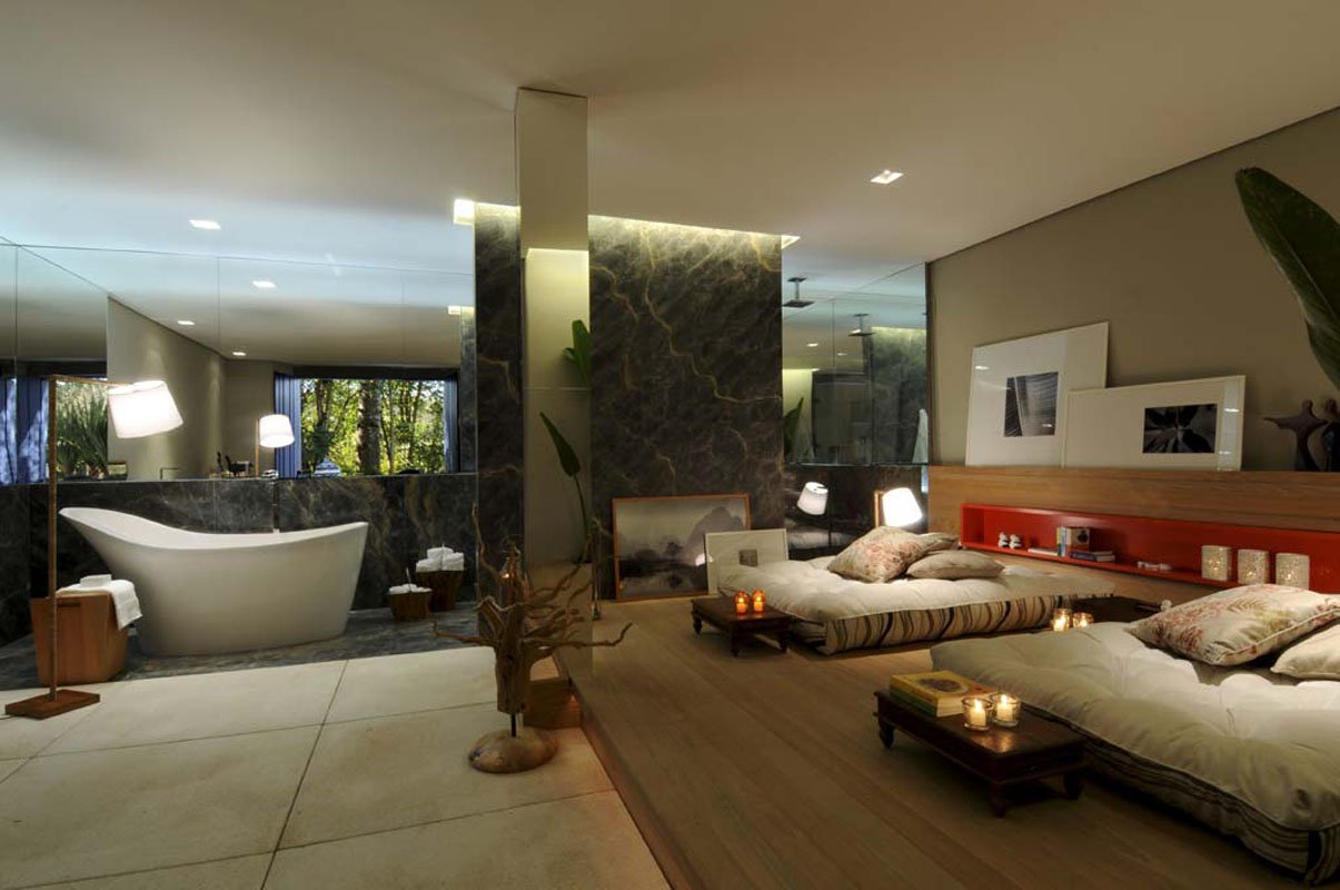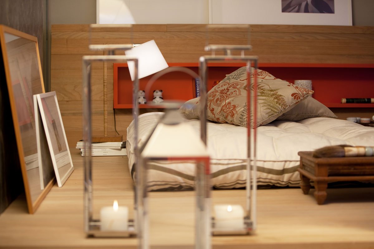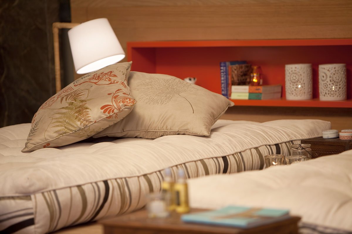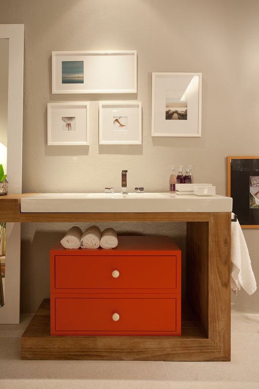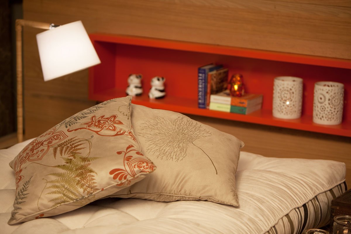 Numa das laterais do ambiente, um tablado de madeira acomoda dois futons, perfeitos para momentos de descanso, leitura ou meditação. Um nicho horizontal amplo apoia objetos e pequenos itens, mantendo tudo organizado e à mão. Já a bancada com cuba foi pensada para valorizar os rituais de autocuidado, tornando cada detalhe mais funcional e agradável.