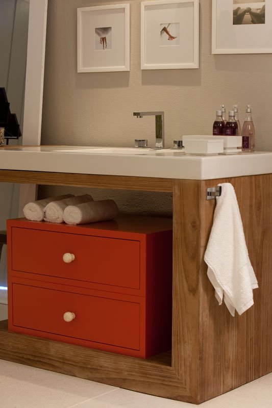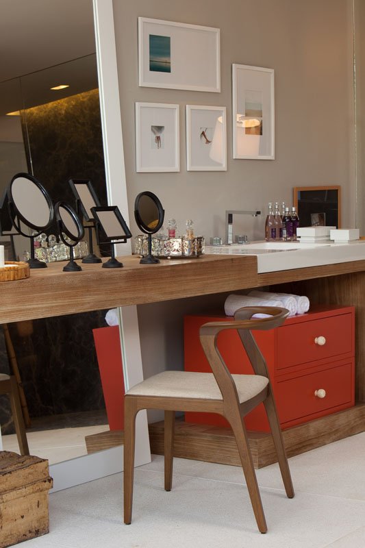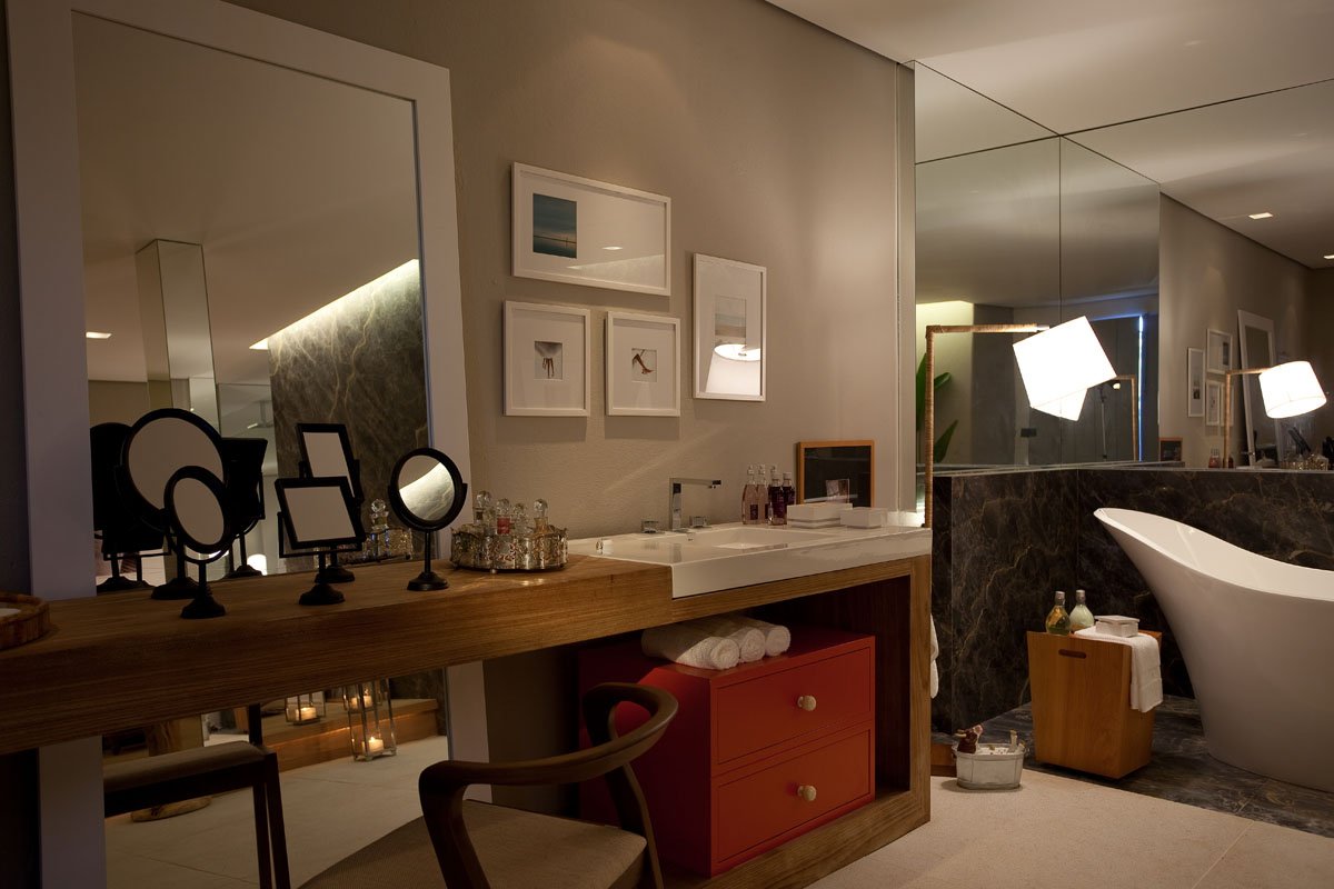 A área do banho, localizada ao fundo, reúne o prazer de uma banheira de imersão e a praticidade de uma ducha de teto, proporcionando uma experiência de spa, ideal para renovar as energias. Os materiais naturais e as cores neutras predominam, criando uma base suave e equilibrada, enquanto a laca em tom coral adiciona pontos de cor que iluminam o espaço.